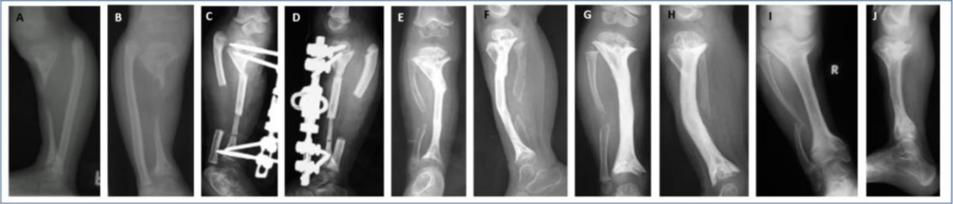 In another case, a fibular graft survived an early infection, but recurrence followed 1 year later. A successful debridement was followed by non-union. Union was achieved with several casts and braces. Tibial lengthening was performed 2 years later.