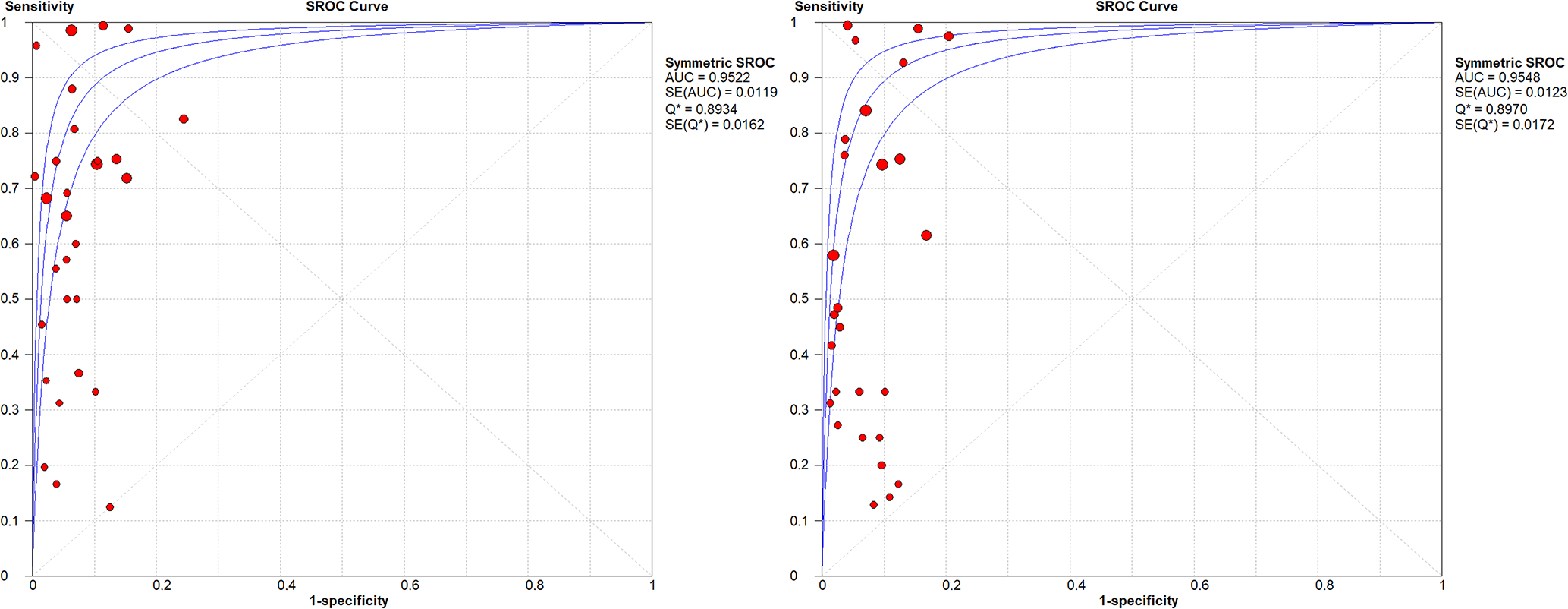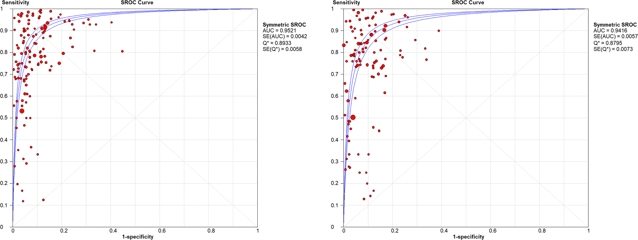 WBC count showed a summary DOR of 58.38 (95 % CI: 48.48–70.32), an AUC of the sROC of 0.952 (SE: 0.0042), and a Q index of 0.893. PMN proportion showed a summary DOR of 43.17 (95 % CI: 35.31–52.79), an AUC of the sROC of 0.941 (SE: 0.057), and a Q index of 0.879 (Fig. 3).