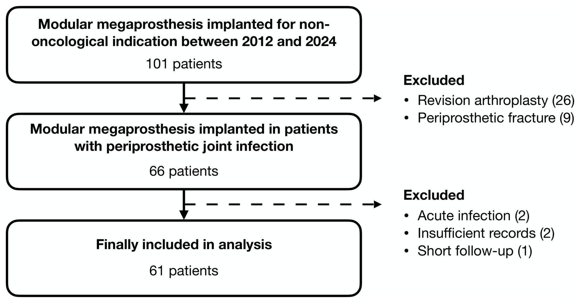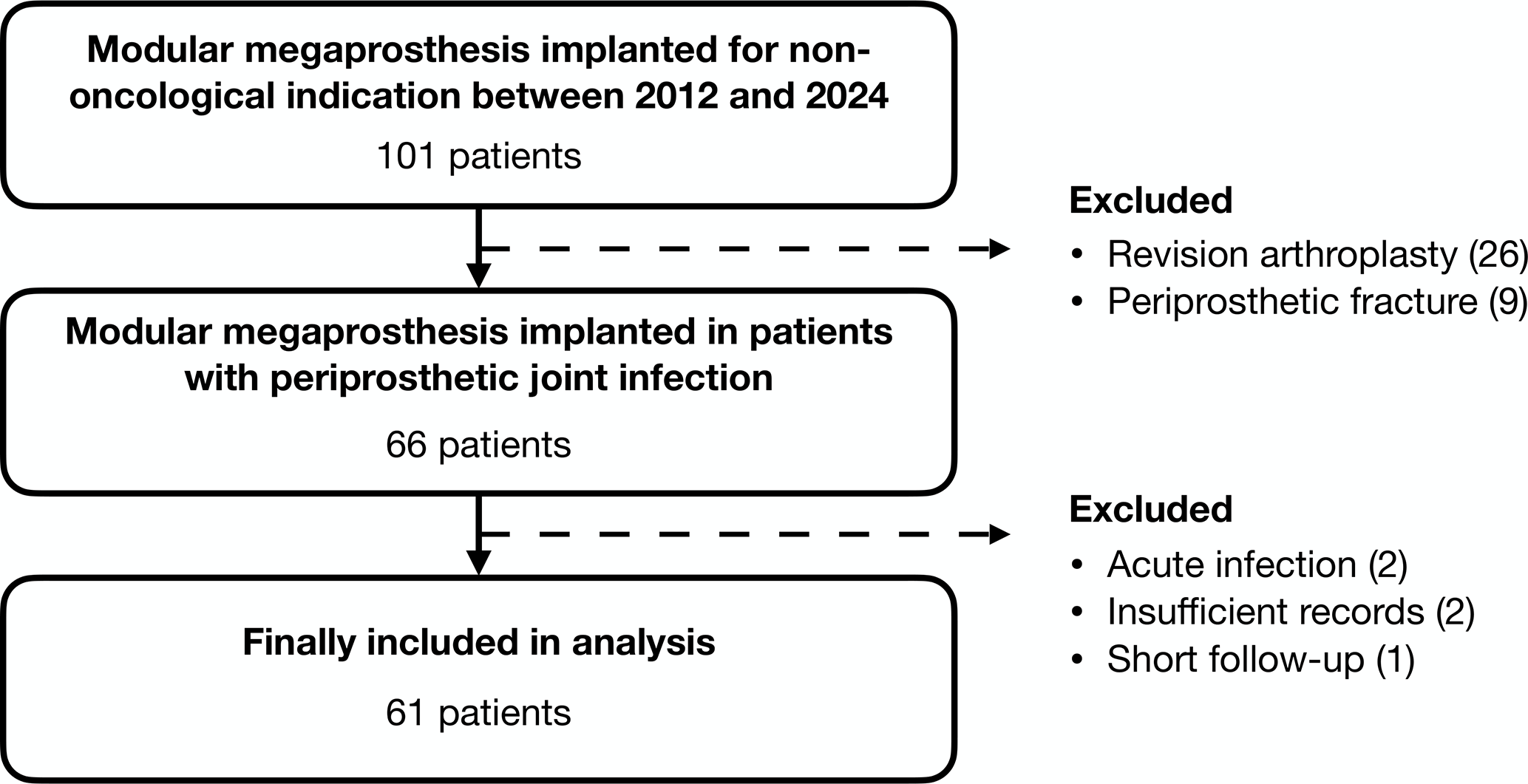 Following institutional review board approval, we conducted a retrospective review of our prospectively maintained database of MMPs implanted for non-oncological indications to identify patients with chronic hip and knee PJIs where MMP was selected as a limb salvage option. All patients were treated at a single referral center with specialized musculoskeletal infection service between January 2012 and December 2024. Patients were included if they met the validated criteria outlined in the 2018 definition of periprosthetic hip and knee infection for the diagnosis of PJI (Parvizi et al., 2018), if PJI occurred more than 3 months since the last revision surgery (Parvizi et al., 2018), if they had a minimum follow-up period of 6 months, and if they possessed complete medical records. We identified 61 eligible patients meeting the inclusion criteria (Fig. 1).