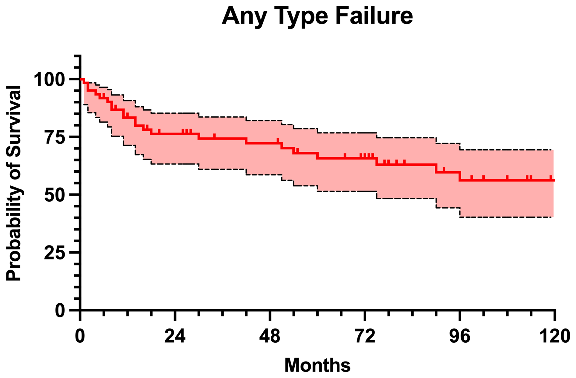 A total of 23 (37.7 %) patients experienced any type of failure of the MMP, with a mean time to failure of 33.4±35.7 months (Table 3). The reasons for failure included 14 infections (Type 4; 60.9 %), four structural failures (Type 3; 17.4 %), three soft-tissue failures (Type 1; 13.0 %), and one aseptic loosening (Type 2; 4.3 %). Additionally, one patient developed an allergic reaction to nickel, requiring exchange for hypoallergenic implant (4.3 %). The failure-free survival rate was 83.4 % at 1 year, 76.3 % at 2 years, 65.8 % at 5 years, and 56.2 % at 10 years of follow-up (Fig. 3). Cox regression identified McPherson host grade > B as significant risk factor for failure (hazard ratio (HR) 3.1, 95 % CI 1.4–7.6; P=0.024), whereas age (HR 1.0, 95 % CI 0.9–1.0; P=0.326), sex (HR 1.2, 95 % CI 0.4–3.6; P=0.723), anatomic site (HR 1.0, 95 % CI 0.3–3.1; P=0.936), ASA score (HR 1.0, 95 % CI 0.4–2.8; P=0.944), presence of high-virulence organisms (HR 0.8, 95 % CI 0.2–2.4; P=0.635), length of modular component (HR 1.0, 95 % CI 0.9–1.1; P=0.620), and number of previous surgeries (HR 1.0, 95 % CI 0.7–1.2; P=0.804) were not significantly associated with failure.