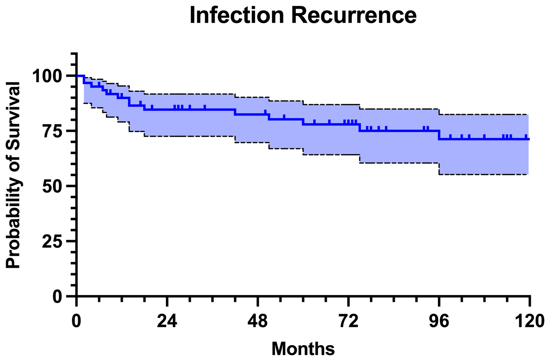 At the last follow-up, 47 patients (77.0 %) remained free of infection. Nevertheless, out of these patients, 9 (19.1 %) had revision surgery for aseptic reasons. The infectious complications were classified as relapse in 10 patients (71.4 %) and as reinfection in 4 patients (28.6 %). The infection-free survival was 90.0 % at 1 year, 84.6 % at 2 years, 80.0 % at 5 years, and 71.3 % at 10 years of follow-up (Fig. 4). Infection-free survival rates were similar in both proximal and distal femur replacement (P=0.093). Additionally, there were no statistically significant differences in infection-free survival rates between one-stage and two-stage exchange regime (P=0.711) or between patients who received a local antibiotic-loaded carrier compared to the ones who did not (P=0.560).