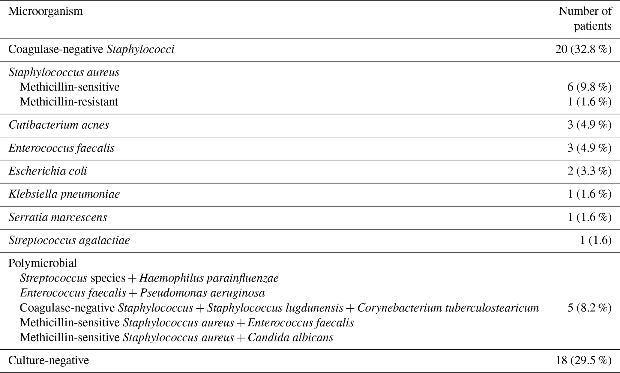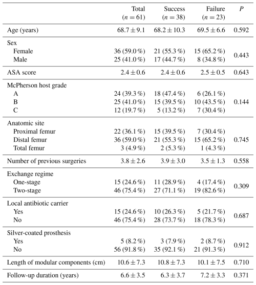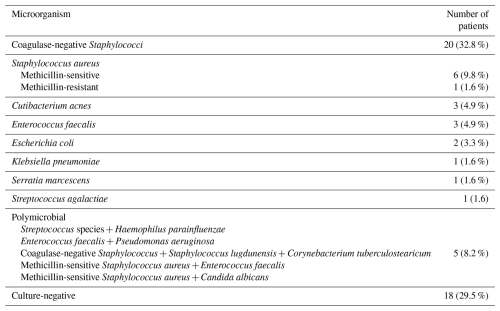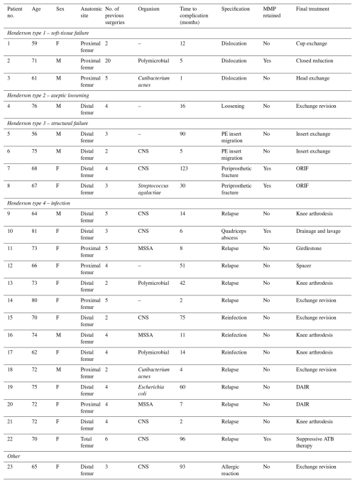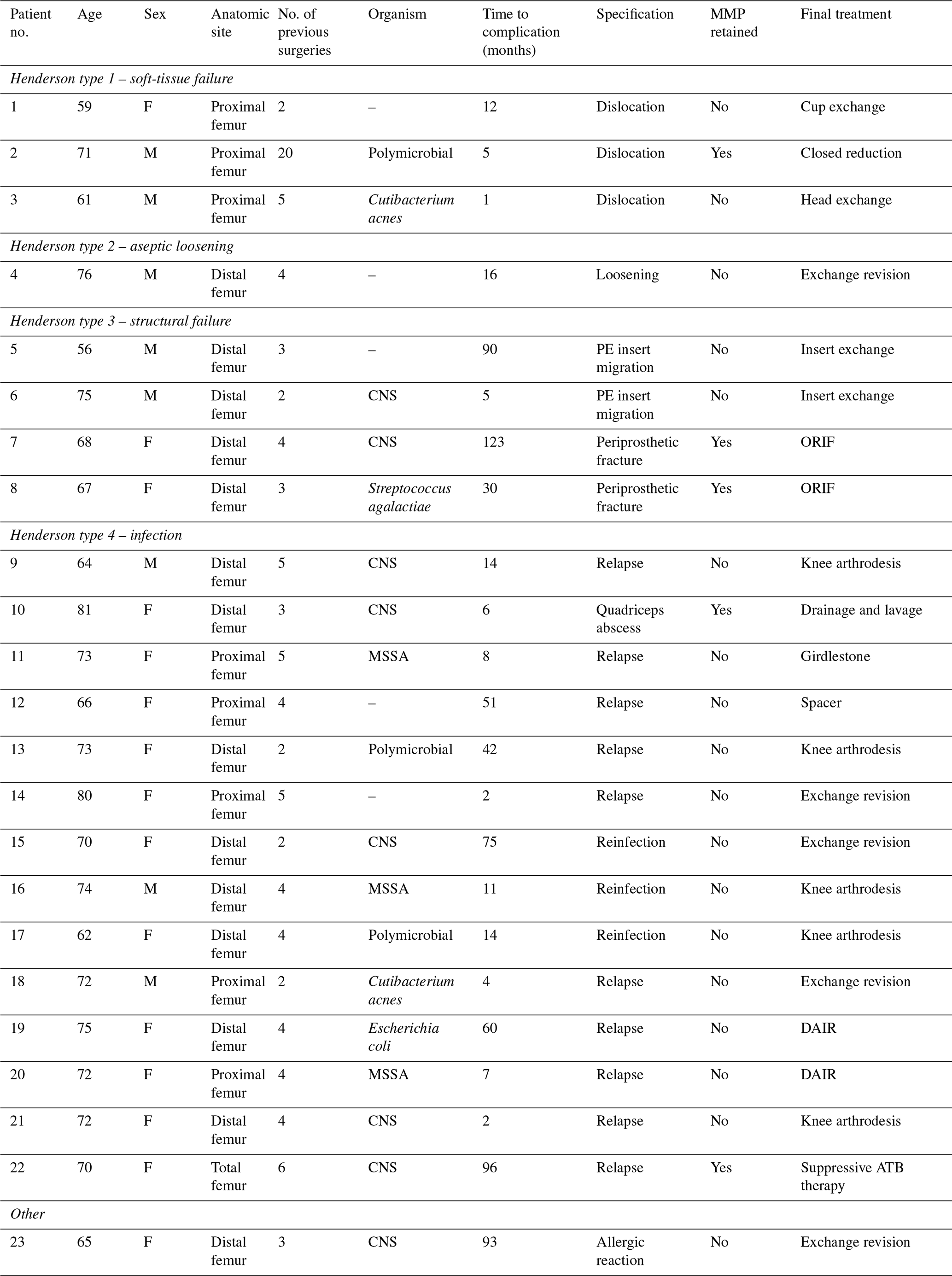 From the total of 61 patients included in the final analysis, there were 36 women (59.0 %) and 25 men (41.0 %), with a mean age at the time of surgery of 68.7±9.1 (range 37–82) years. A total of 22 patients (36.1 %) underwent proximal femur reconstruction, 36 patients (59.0 %) had distal femur replacement, and the remaining 3 patients (4.9 %) underwent total femur replacement. The mean follow-up duration was 6.6±3.5 years. All patients had multiply revised arthroplasty prior to the MMP implantation (Table 1). The most frequently isolated microorganism was coagulase-negative Staphylococcus (20 cases; 32.8 %), followed by methicillin-sensitive Staphylococcus aureus (7 cases; 11.5 %). Cultures were negative in 18 patients (29.5 %), despite clear signs of infection fulfilling the diagnostic criteria. Complete microbiological results are attached in Table 2.