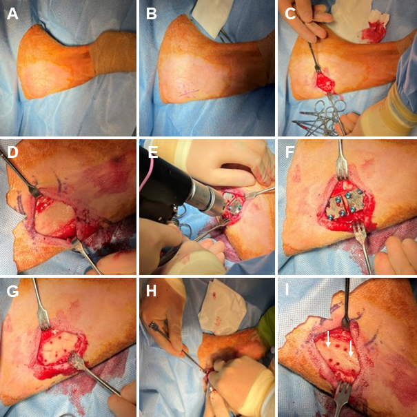 Figure 1Representative photos of the surgical procedure. (A) Sterile Coban is wrapped around the distal leg, and sterile drapes surround the surgical site. The skin is prepped with a povidone-iodine and alcohol presurgical skin preparation. (B) The incision line and fixation plate location are marked ∼ 5 cm distal to the tibial tuberosity. (C) A 5 cm incision is made parallel to the anterior margin of the tibia. (D) Skin, subcutaneous tissue, and the periosteum are removed from the bone surface. (E) Template plate areas are drilled to mark the location where the biofilm-ridden fixation plates will reside. (F) An image of the template plates secured with cortical bone screws. (G) The template plates and cortical bone screws are removed. (H) A modified bone saw is used to create a simulated fracture in the area under each plate at a depth of ∼ 2 mm and at an angle of ∼ 20° from the axial direction along the host bone. (I) An image of the completed simulated fractures, which are indicated by white arrows.