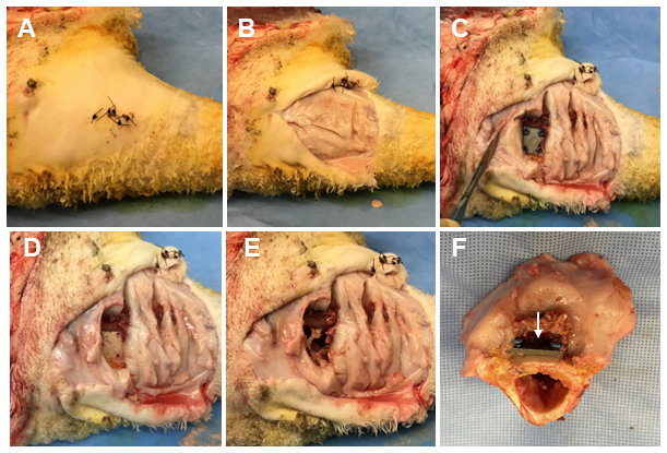 Figure 2Representative photos of the necropsy sample collection. (A) The skin is cleansed using a presurgical skin preparation technique with three alternating scrubs of povidone-iodine and alcohol. (B) The original surgical incision is reopened using sterile techniques, exposing the underlying tissue. (C) The tissue directly under the distal fixation plate is collected, exposing the plate and cortical bone screws. (D) A torque meter (not pictured) with sterilized hex bits is used to remove the cortical bone screws and the fixation plate. (E) A surgical drill with sterile trephines is used to remove the cortical bone surrounding each screw track and a section of bone directly under the fixation plate. (F) The sectioned bone containing the proximal fracture fixation plate (indicated by a white arrow).