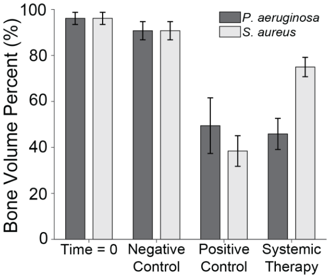 Another limitation was the duration of antibiotic therapy. Animals received 10 d of systemic antibiotics, after which they survived for an additional 11 d. This duration is shorter than clinical treatment timelines, which typically extend for several weeks and may continue for months in difficult, recalcitrant infections (Prada et al., 2020). In this model, the shortened therapy may have allowed bacterial persistence or regrowth, and infection may have been resolved if therapy had been continued. This design was intentional, to capture infection dynamics following a defined course of systemic therapy, rather than to model complete clinical resolution. Given the well-documented resilience of biofilms and their ability to tolerate therapeutic concentrations of antibiotics, we aimed to evaluate whether bacteria seeded as mature biofilms could withstand a standard treatment regimen and assess microbiological and histological outcomes at a later time point. This strategy also allowed direct comparison with our previous work evaluating systemic vancomycin against MRSA biofilms in the same model (Williams et al., 2025). By establishing the performance of systemic therapy after 10 d of treatment versus S. aureus and P. aeruginosa, we develop the foundation for a clinically relevant preclinical platform for testing novel antimicrobial strategies that may address the limitations of systemic therapy. The ovine model employed offers translational advantages, including the ability to accommodate human-scale medical devices and delivery systems. This positions the model as a valuable tool for evaluating emerging therapeutic approaches such as localized antibiotic delivery, antimicrobial biomaterials, or other combination strategies that integrate surgical intervention with targeted antimicrobial technologies. By characterizing the baseline efficacy of standard systemic therapy, this work establishes a foundation for comparative assessment of novel interventions designed to manage FRIs.