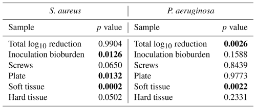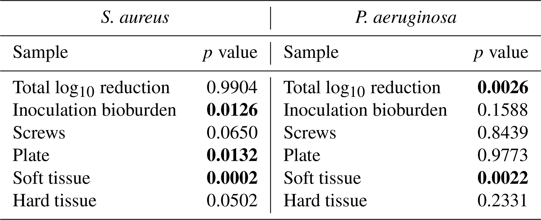 Microbiological analysis compared the mean log10 reductions in CFUs (normalized to sample or by weight) between the treatment groups. The control plate CFUs were averaged for each animal, and a log10 transformation was applied to provide a baseline inoculum. Recovered samples that did not grow any CFUs were reported at the limit of detection (LOD) by artificially adding one colony to the least diluted plate. The normalized CFUs for each sample were summed for each animal, and the log10 transformation was applied to determine the total recovered bioburden. The mean log10 reduction was calculated as the difference between the log10-transformed control plate doubled CFUs (to account for two inocula plates) and the total sample CFUs. Positive log10 reductions indicated bacterial bioburden was reduced from the initial inoculum. Group means were tabulated and compared using a two-sample t test. A p value < 0.05 was considered statistically significant. Comparisons between individual sample bioburden and inocula were similarly compared with two-sample t tests, where a p value < 0.05 was considered statistically significant.