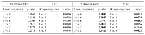Reactive (fluorescent microscopy) and woven bone (backscattered electron imaging) analyses were also compared using two-sample t tests. Group means were tabulated and compared, with a p value < 0.05 used to indicate statistical significance. Osteoclast and μ-CT analyses used multiple locations, which introduced data clustering. A mixed-effect linear regression (multilevel model) accounted for nested locations within each sheep. The experimental condition (group) was a fixed effect, and the sheep was a random effect. Analyses were based on the t statistic due to the experimental sample size.
