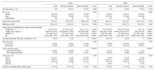 rTHA, revision total hip arthroplasty; rTKA, revision total knee arthroplasty; SD, standard deviation; BMI, body mass index, IQR, interquartile range; seCRP, serum C-reactive protein; syWBC, synovial white blood cell; syPMN, synovial polymorphonuclear leukocytes; SG, specific gravity; ASA, American Society of Anesthesiologists; * significant difference.