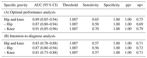 Table 2Diagnostic accuracy of synovial fluid specific gravity assessed through receiver operating curve analysis, conducted via (A) optimal performance analysis, which excludes non-readable tests due to blood-contaminated synovial fluid, and (B) intention-to-diagnose analysis, where non-readable tests were considered to be negative results.