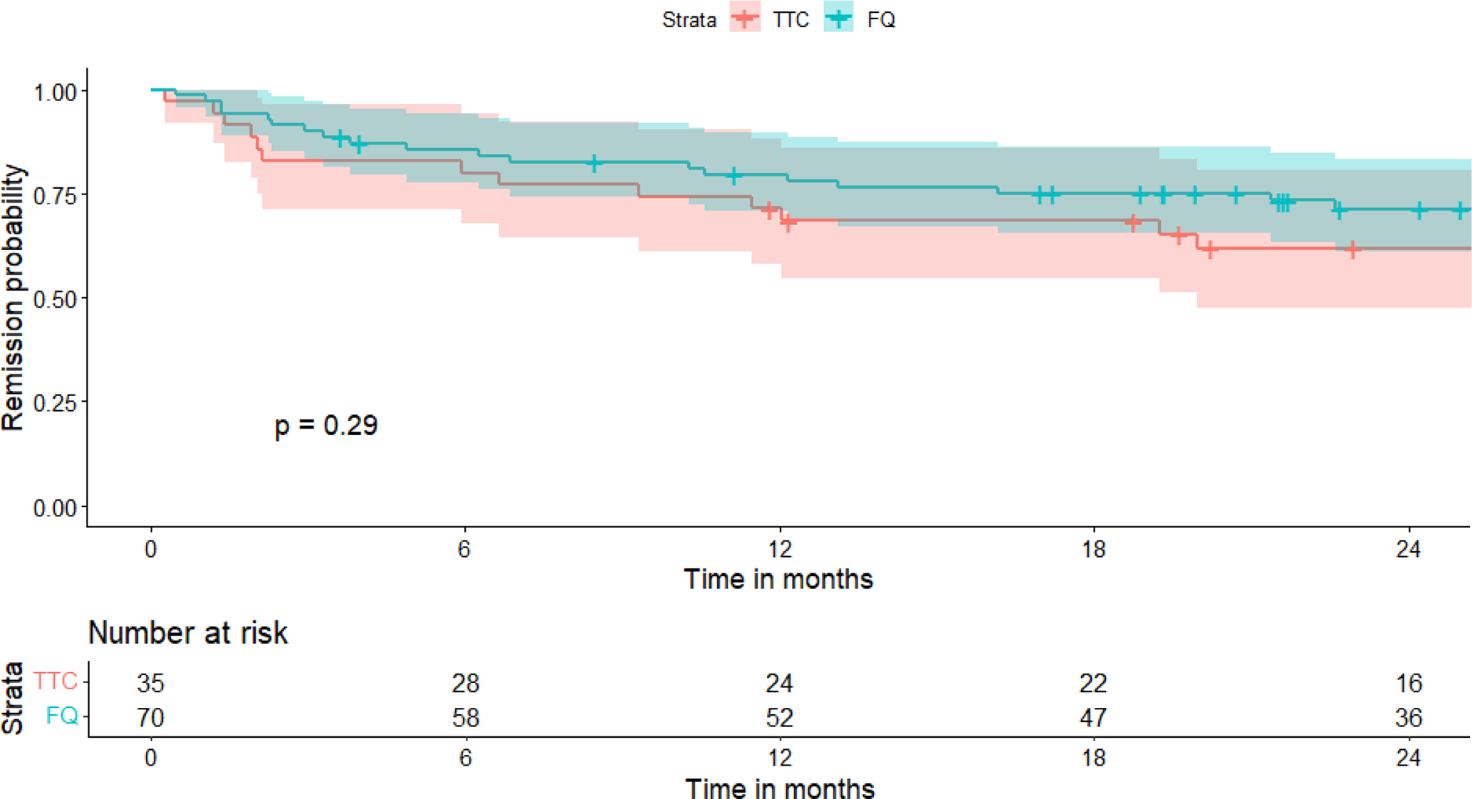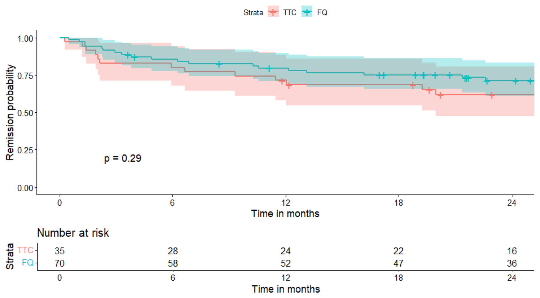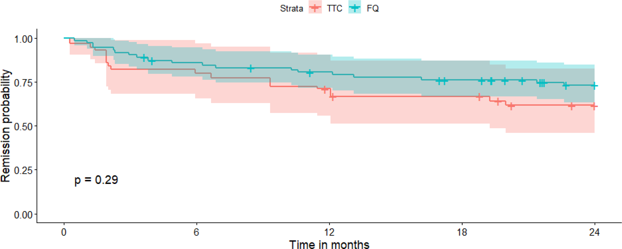Figure 1Survival curve in the two treatment groups (univariate analysis). TTC: tetracycline; FQ: fluoroquinolone.