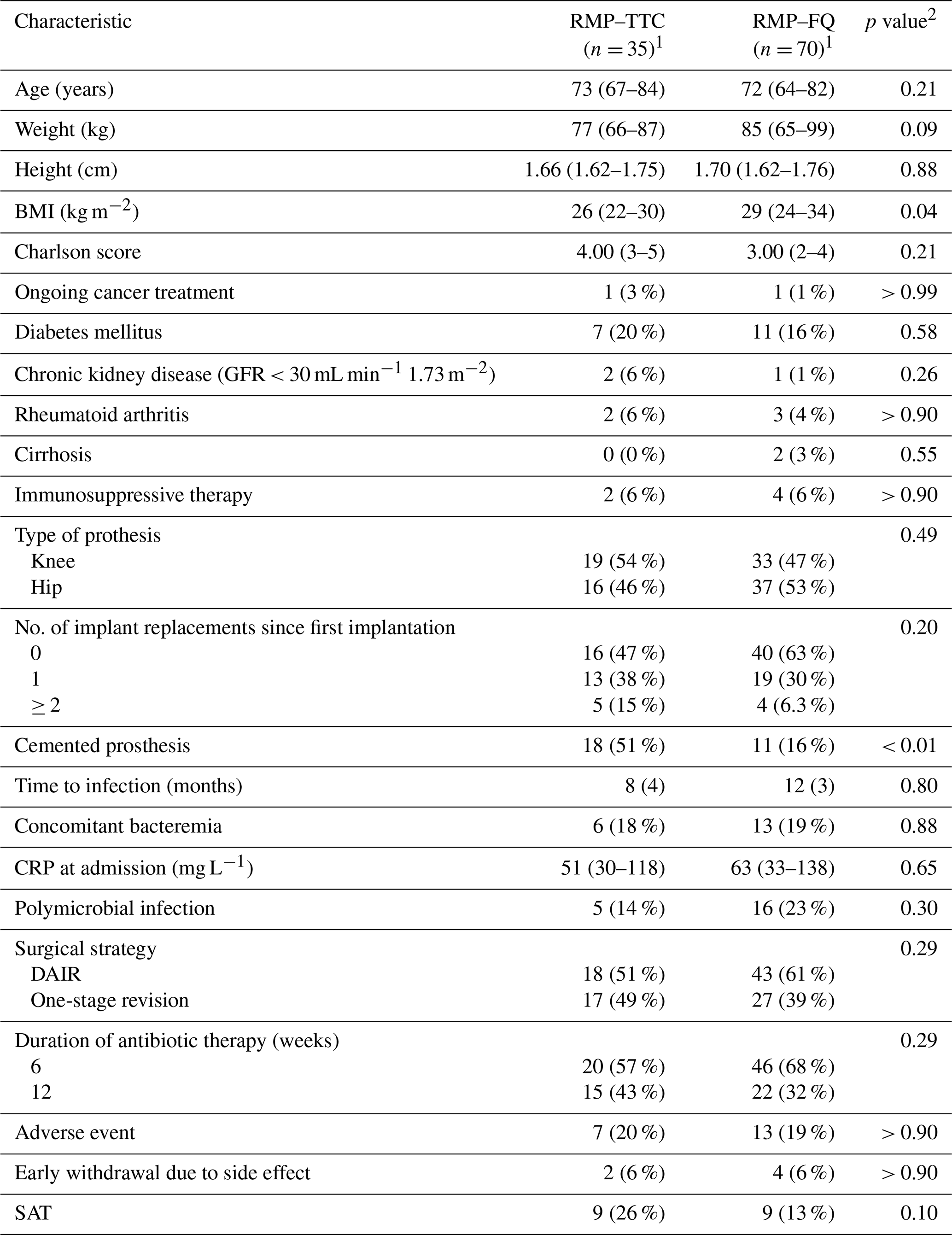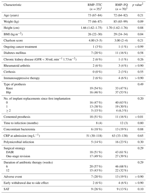 1 n (%) and median (Q1, Q3). 2 Wilcoxon rank-sum test and Fisher's exact test. RMP–TTC: rifampicin–second-generation tetracycline agent, RMP–FQ: rifampicin–fluoroquinolone, BMI: body mass index, GFR: glomerular filtration rate in CKD-EPI, No: number, CRP: C-reactive protein, DAIR: debridement antibiotics and implant retention, SAT: suppressive antibiotic therapy.