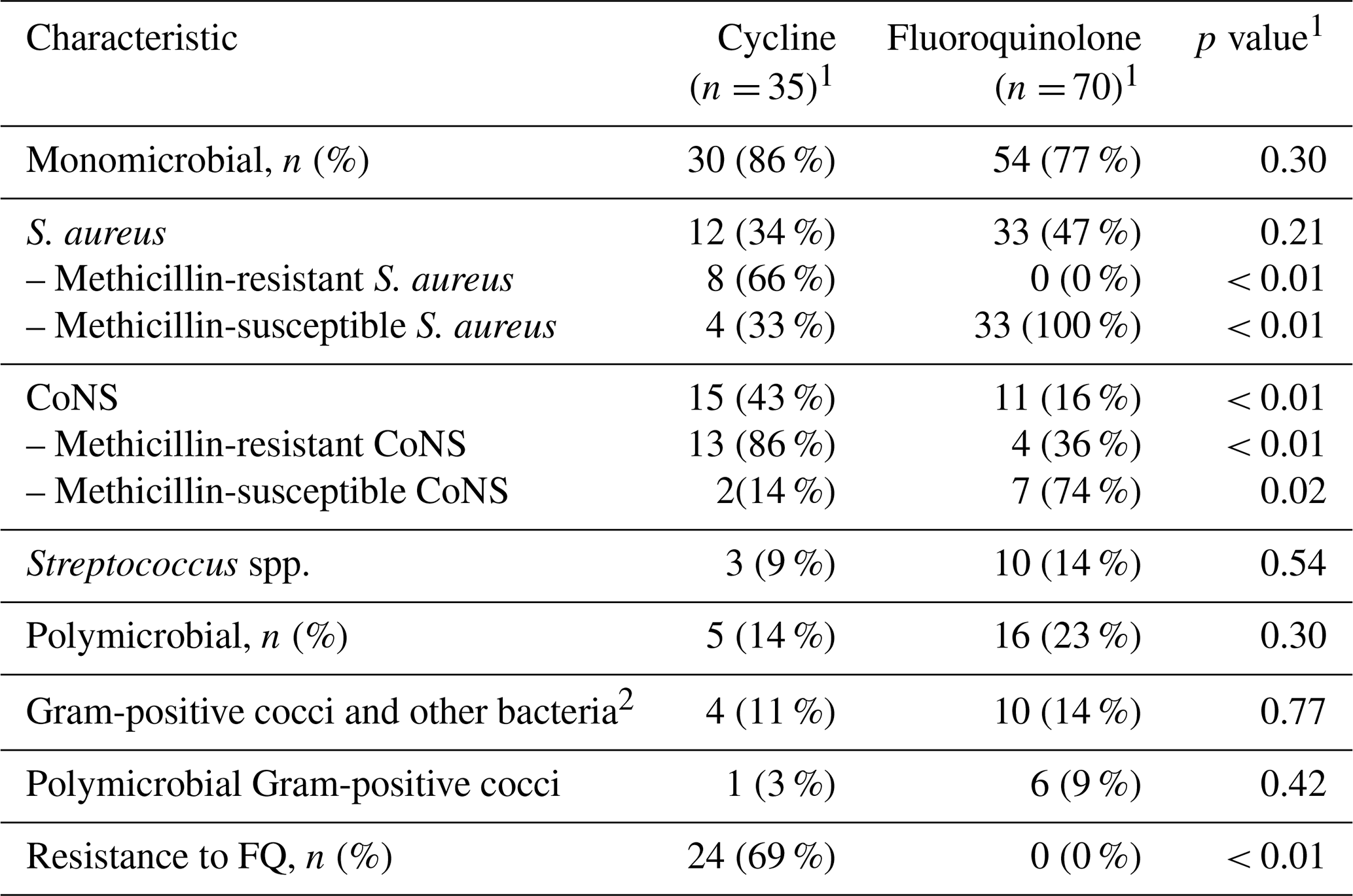 Most infections were monomicrobial: 30 (86 %) in the RMP–TTC group and 54 (77 %) in the RMP–FQ group. Staphylococcus spp. were the most isolated pathogens, identified in 27 (77 %) of the patients in the RMP–TTC group and in 44 (63 %) of the patients in the RMP–FLQ group. All methicillin-resistant S. aureus (MRSA) isolates were found in the RMP–TTC group (8 (66 %)). Coagulase-negative staphylococci were significantly more frequent in the RMP–TTC group (15 (43 %) vs. 11 (16 %), p= 0.002). Details of the microbiological documentation are presented in Table 2.