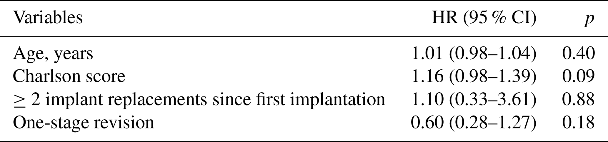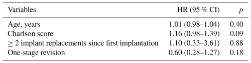 In a cause-specific sensitivity analysis focusing on infection-related failure, deaths adjudicated as unrelated to PJIs were not considered failures, and follow-up was censored at the date of death. This approach assumes that, conditional on covariates, censoring due to unrelated death is non-informative with respect to the hazard of infection-related failure.