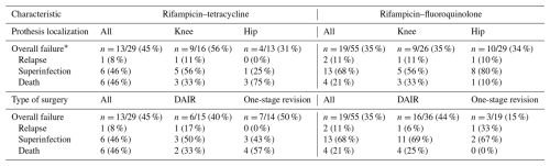 The main result of this survey is that we did not find any significant difference in terms of failure at 2 years when comparing the therapeutic efficacy of RMP–TTC (doxycycline or minocycline) versus RMP–FQ (levofloxacin, ciprofloxacin, moxifloxacin) in patients with PJIs. The rate of adverse effects reported in the two groups was also similar.