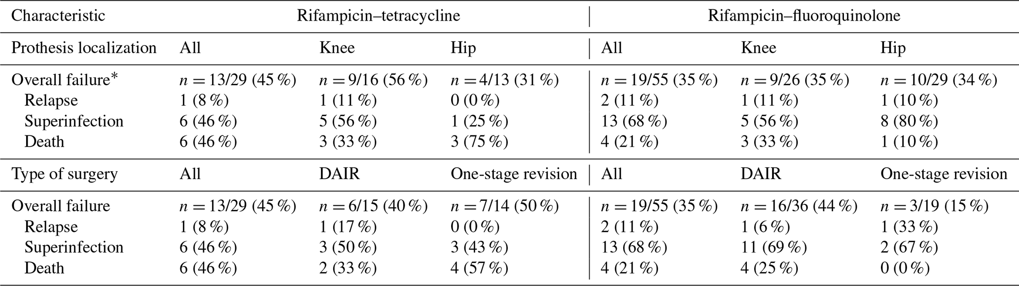 The primary outcome was failure. Failures included relapse (i.e., recurrence of the infection caused by the same microorganism), superinfection (i.e., caused by a different bacterium not previously identified), or death. Following Escudero-Sanchez et al. (2020), suppressive antibiotic therapy (SAT) was defined as an antibiotic therapy prescribed for an indefinite duration and initiated as a follow-up to an initial treatment lasting 6 to 12 weeks for patients in remission (i.e., lack of clinical symptoms or radiological signs). Indications of SAT were decided at the beginning of management in cases where the infection could not be eradicated, particularly in situations of suboptimal management (DAIR performed after 4 weeks, retention of infected material). Consequently, SAT was not regarded as failure. Adverse events potentially attributable to antibiotics were classified according to the Common Terminology Criteria for Adverse Events (CTCAE) (Common Terminology Criteria for Adverse Events – UpToDate, 2023).