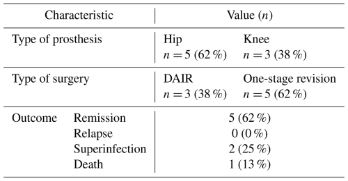 Jang, T. L., Hewlett, A., and Cortes-Penfield, N. W.: High Efficacy of Oral Tetracyclines in Prosthetic Joint Infection Treated With Debridement, Antibiotics, and Implant Retention (DAIR) or Resection Arthroplasty With Destination Spacer Placement, Cureus, 16, e59599, https://doi.org/10.7759/cureus.59599, 2024.