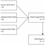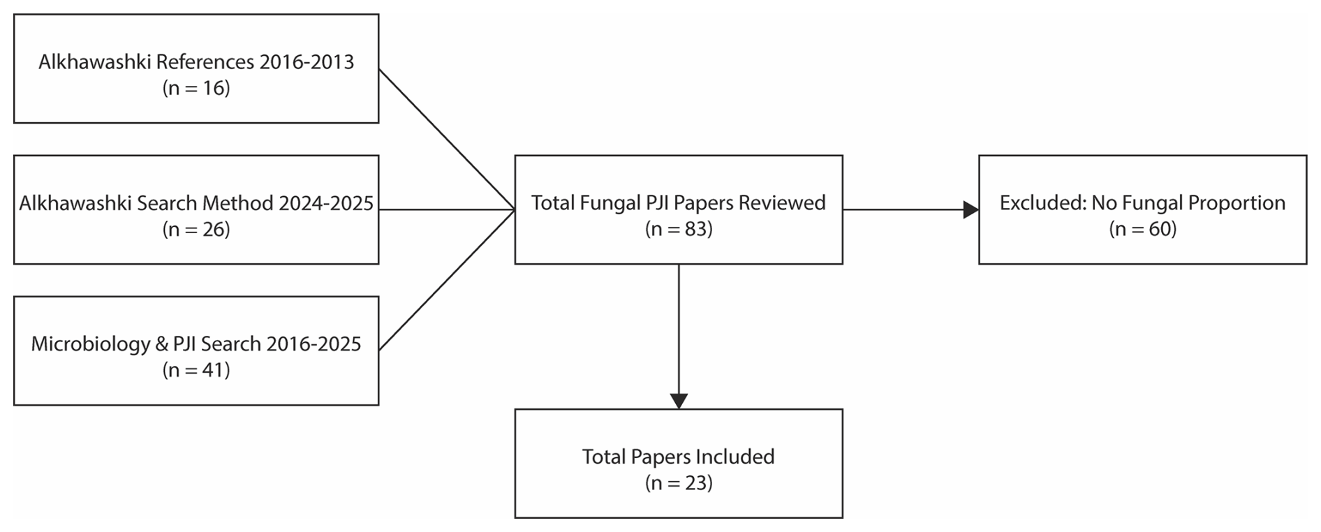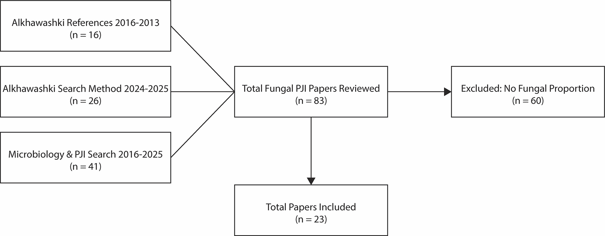 A recent meta-analysis identified English-language publications reporting outcomes on ≥5 patients with diagnosed hip or knee fungal PJI between 2009 and 2023 (Alkhawashki et al., 2025). All studies published between 2016 and 2023 included in this meta-analysis were reviewed. To extend capture beyond this cohort, a structured literature search was independently conducted for studies published from January 2024 through October 2025 using PubMed. The primary search string was “fungal periprosthetic joint infection”, applied to titles and abstracts. In parallel, a secondary PubMed search was performed, following the methodology described by Tai et al. (2022a), using the Boolean search strategy “hip” OR “knee” AND “periprosthetic joint infection” AND “microbiology aetiology” for publications from 2016 through October 2025. Reviewed studies were included if they reported microbiologic results from preoperative or intraoperative samples and allowed calculation of the proportion of PJI cases with evidence of Candida involvement. Studies were excluded if microbiologic data were insufficient to determine Candida involvement. This process yielded 23 studies for inclusion (Fig. 1).