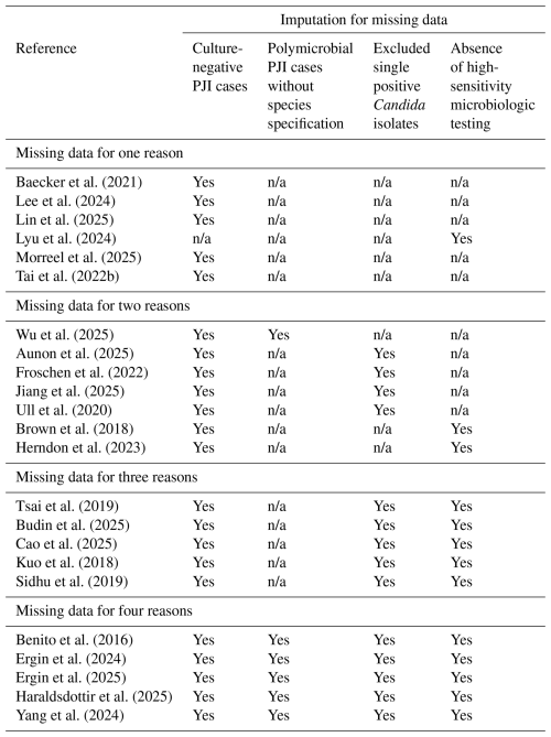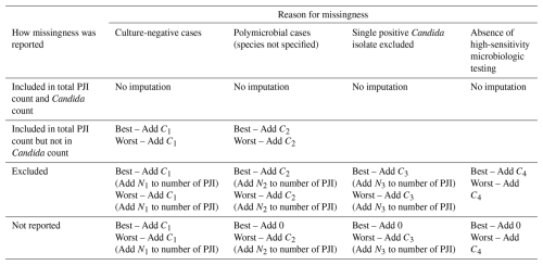 Best-case and worst-case scenarios were defined to bound the plausible range of Candida involvement under varying assumptions regarding missing microbiologic data. The best-case and worst-case scenarios of the sensitivity analysis for each missingness reason were determined (Table 1). These scenarios depend on whether PJI patients were included in the study without microbial data, specifically excluded from the study, or not reported (and therefore potentially included or excluded). When patients with expected Candida involvement were known to be missing, they were added to both the best-case and worst-case scenarios. If the number of PJI patients affected by a missingness category was not reported, no imputation was performed for the best-case scenario (Add 0). When PJI patients were excluded or assumed to be excluded in worst-case scenarios, the number of missing PJI patients for that reason (Ni) was added to the total number of PJI patients before recalculating the proportion of patients expected to have Candida involvement, to avoid overestimation.