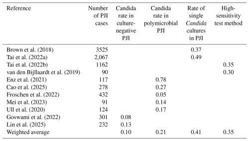 The number of PJI patients with missing data for Candida is often reported directly in the paper (e.g., number of culture-negative patients). If such patients are excluded, or not reported and assumed to be excluded in worst-case sensitivity calculations, the number of missing patients (mi) was calculated by multiplying the total number of PJI patients in the study (Ni) by the proportion (pi) of PJI patients in the literature with the same reason for missingness (e.g., percentage of culture-negative PJI cases): .