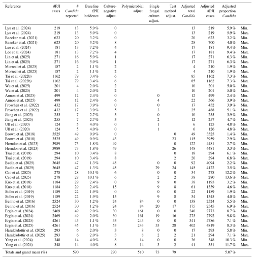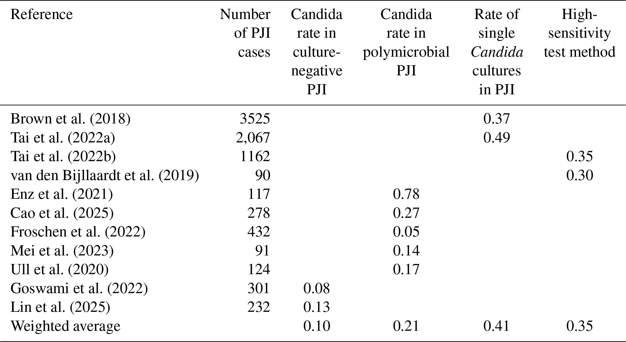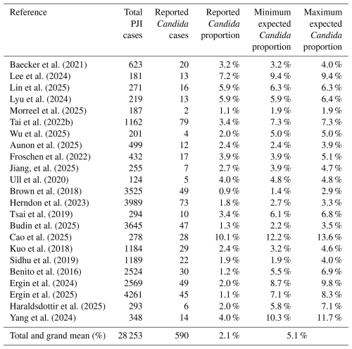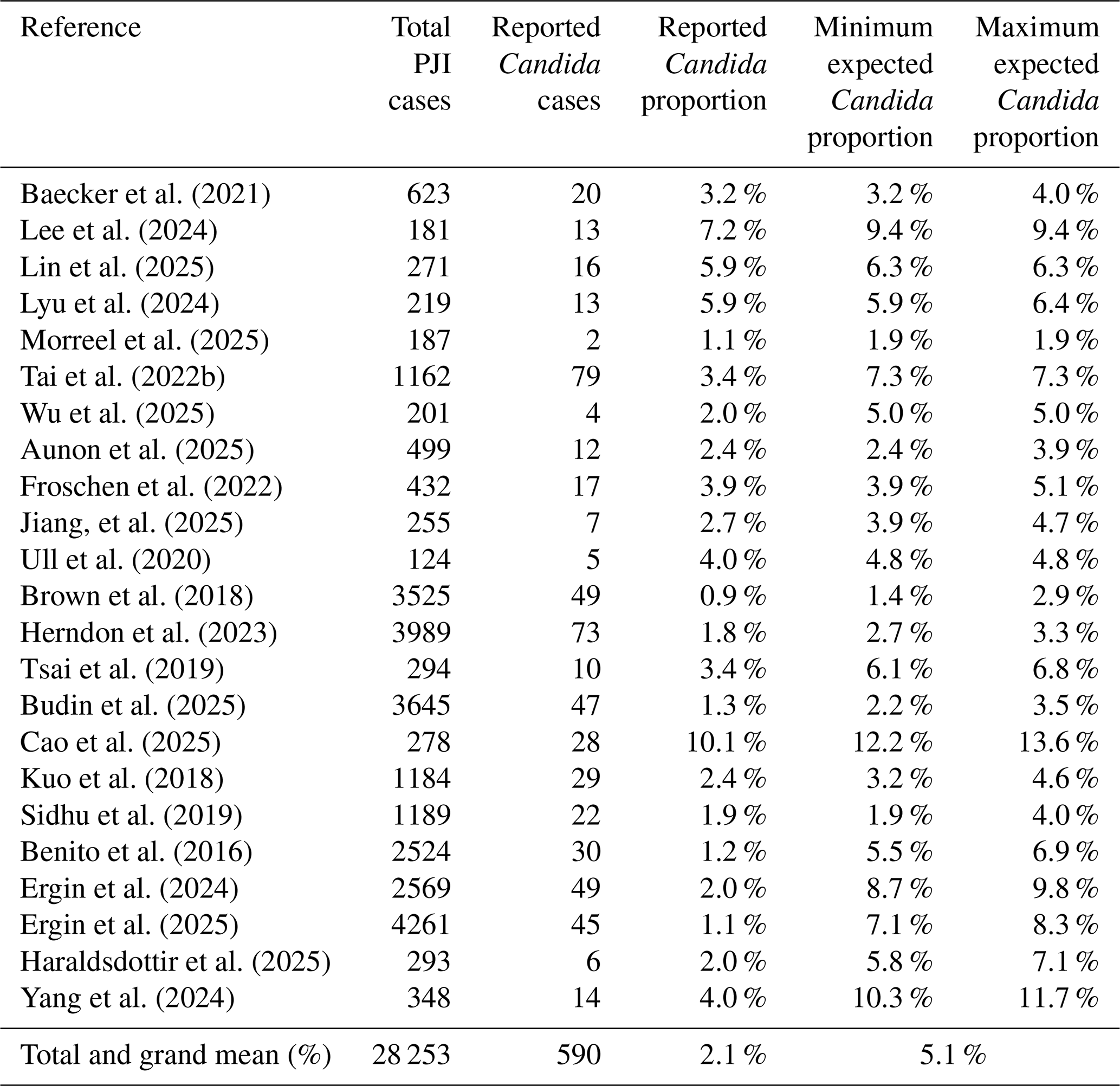 After adjusting for missing data, the expected proportion of Candida PJI increased to 5.1 % across all studies (range: 1.4 %–13.6 %). This estimate was derived by adding the expected number of additional Candida cases for each missingness variable (Table A1). Most adjustments were attributable to unreported microbial species in polymicrobial cases (53 %) and unknown microbiology in culture-negative PJI cases (30 %).