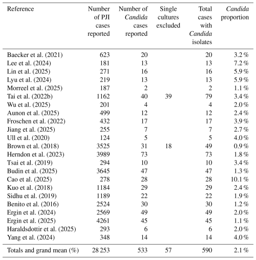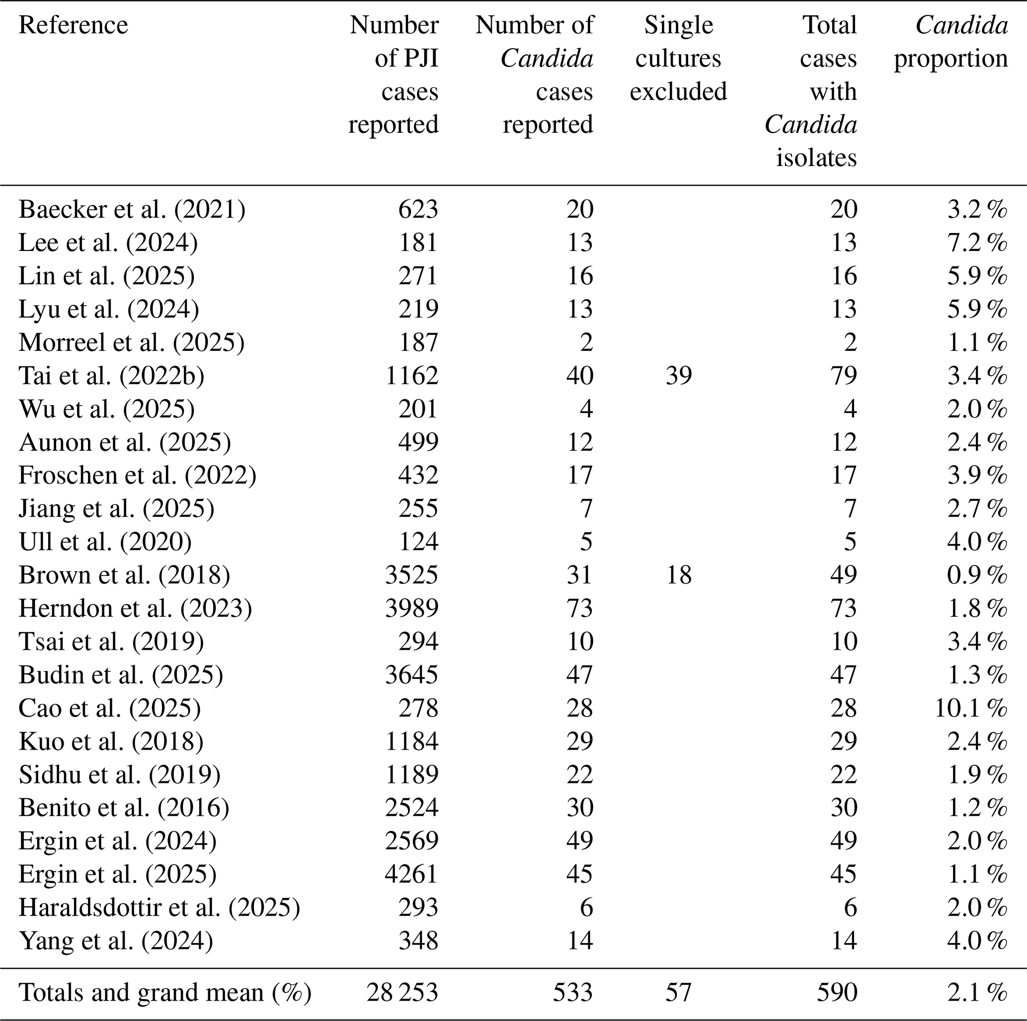 A total of 23 studies met inclusion criteria, reporting a combined total of 28 253 PJI patients (Table 3). Candida PJI was identified in 533 patients (1.9 %). When patients with a single positive Candida culture were included, the total increased to 590 patients (2.1 %). Across all included studies, the reported incidence of Candida PJI ranged from 0.9 % to 10.1 %.