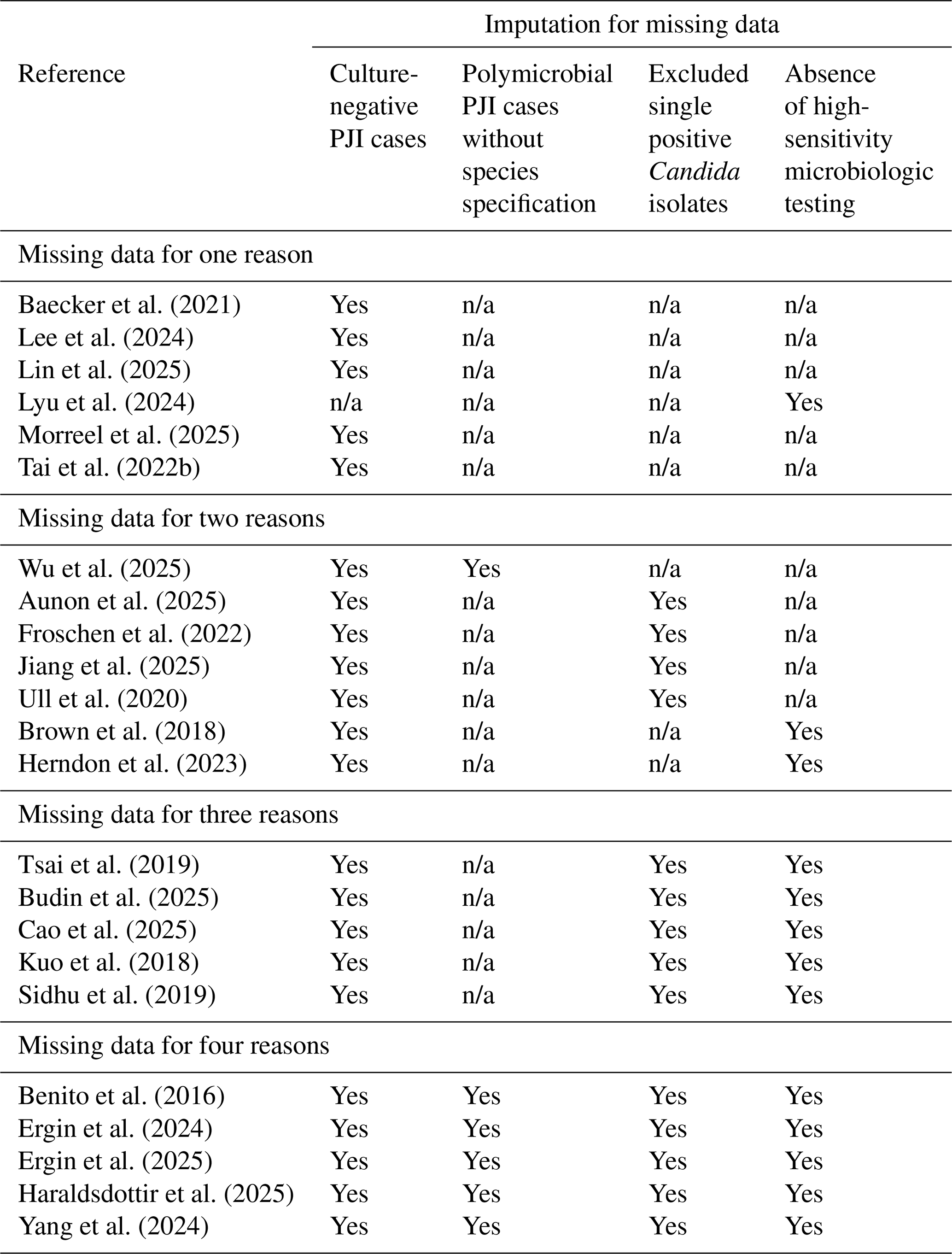 Among all included studies, only the series by Lyu et al. (2024), which used NGS to detect Candida in culture-negative cases, did not require imputation for the culture-negative category. Missingness due to unreported polymicrobial species required imputation in 6 studies, exclusion of single positive Candida isolates in 13 studies, and absence of high-sensitivity culture methods in 12 studies. The incidence of Candida PJI was then recalculated after applying imputation for each missingness category (Table 5).