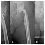 Figure 3(A) Anteroposterior pelvic radiograph of a patient with chronic prosthetic joint infection of the left hip. The patient had previously undergone multiple procedures involving osteosynthesis material. Both the patient's medical history and the diffuse radiographic appearance of the proximal femur suggested bone involvement compatible with osteomyelitis. (B) A wide resection of the proximal femur was undertaken, and a preformed spacer was implanted. Histological analysis revealed mild neutrophil infiltration and chronic inflammatory changes within trabecular bone and bone marrow, consistent with osteomyelitis. (C) Hip reconstruction was subsequently performed using a megaprosthesis owing to the substantial bone loss in the proximal femur. This procedure may also be undertaken in a one-stage approach, although accurately determining the true extent of femoral bone involvement can be challenging.
