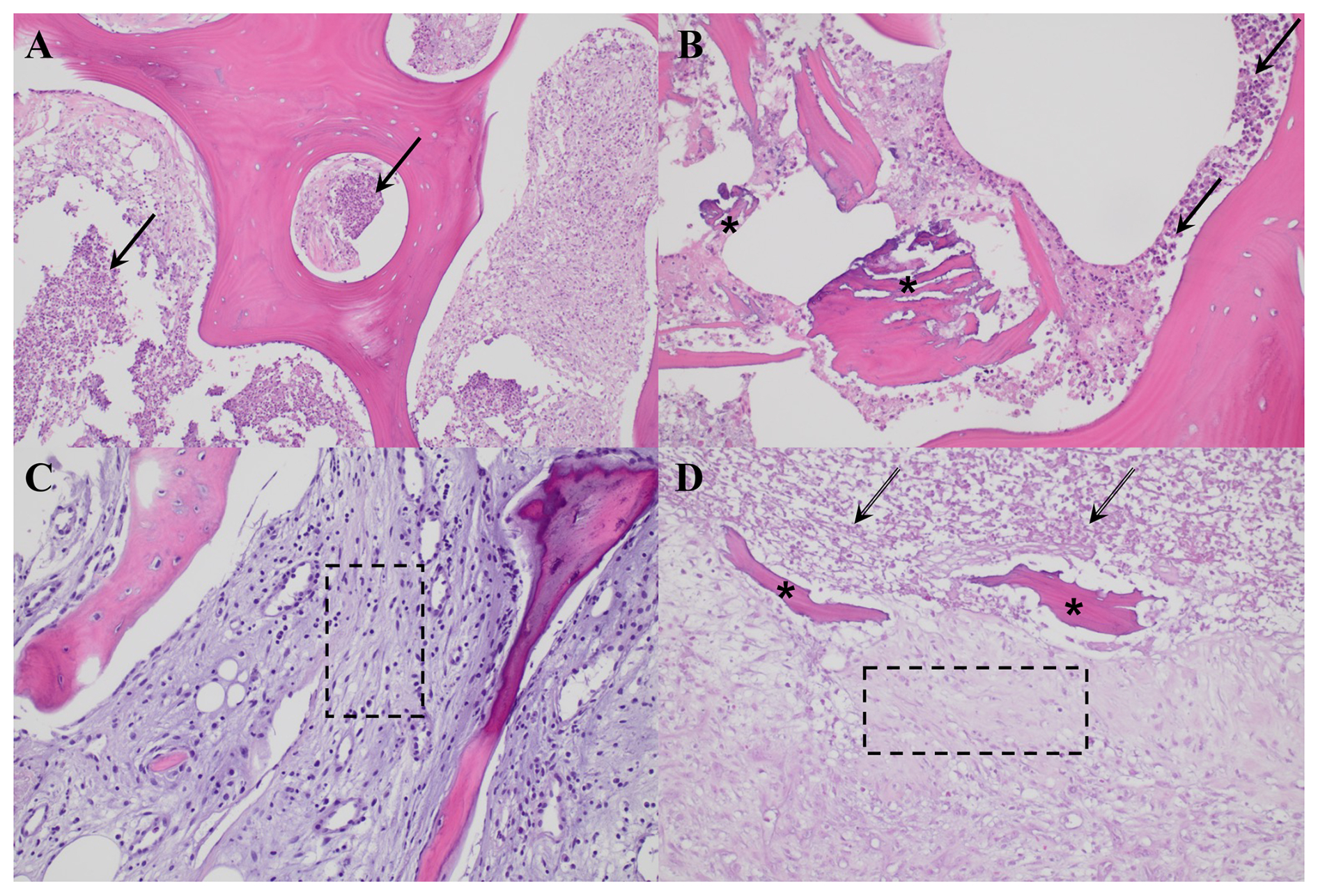 Figure 1Histological images corresponding to two representative cases of osteomyelitis, as presented in Table 2. Panels (A) and (B) correspond to case 5, illustrative of a more acute presentation, while panels (C) and (D) represent case 8, indicative of a more chronic process. (A) Histological section (H&E, ×200) showing lamellar bone infiltrated by dense neutrophil infiltration (black arrows). (B) High-power view (H&E, ×400) revealing an area of necrotic bone (asterisks) surrounded by abundant neutrophils (black arrows) and cellular debris. (C) Histological section (H&E, ×200) showing trabecular bone displaying reactive changes, with bone marrow exhibiting fibrosis and chronic inflammatory infiltrates (dashed-line box). (D) Histological section (H&E, ×200) showing necrotic bone (asterisks) surrounded by fibrosis and inflammatory cells (dashed-line box) and cellular debris (dashed arrows).