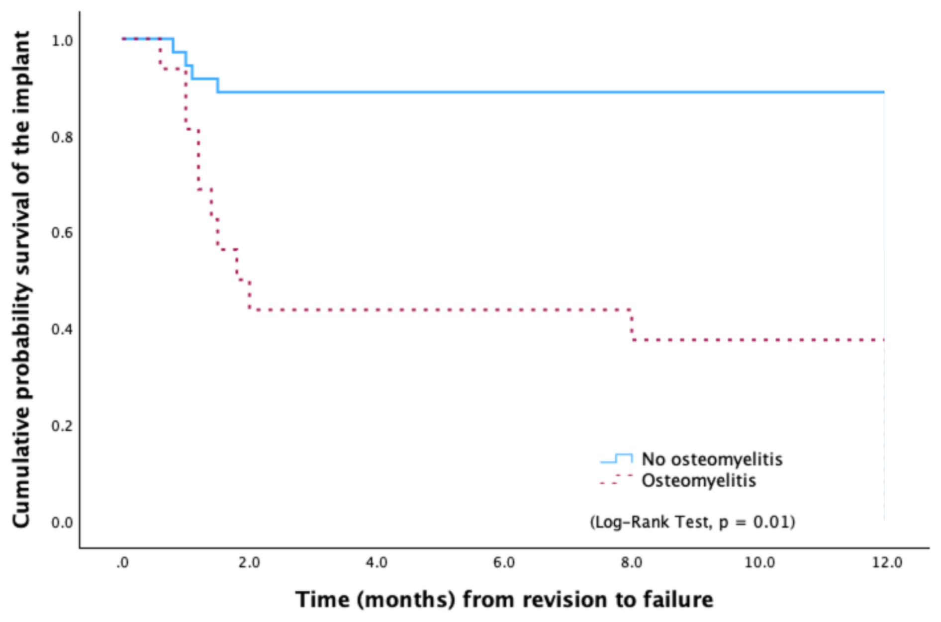 In cases where no signs of osteomyelitis were observed, the 1-year failure rate was 11.1 %. Conversely, when osteomyelitis was present, the failure rate increased markedly to 62.5 %, primarily due to the need for additional debridement and spacer exchange (Fig. 2).