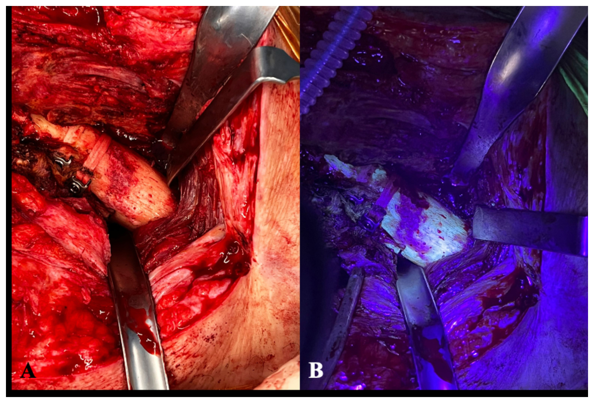 Surgical excision of non-viable bone is often challenging due to the difficulty in distinguishing necrotic from viable tissue. Few tools are available to assist surgeons during this process, and bone appearance remains somewhat subjective and dependent on the surgeon's judgment (Abdelaziz et al., 2021; Lew and Waldvogel, 2024; Rupp et al., 2020). Alternative techniques have been proposed to visualize infected tissue, such as laser Doppler flowmetry or intra-articular methylene blue (Duwelius and Schmidt, 1992; Rosenberg and Khurana, 2016). In our experience, tetracycline bone labeling combined with Wood's lamp detection of non-viable bone provided a visual contrast between viable and necrotic areas under ultraviolet light (McPherson et al., 2002). In the present series, none of the patients were undergoing tetracycline treatment at the time of bone sample collection; however, when available, Wood's lamp was used intraoperatively to guide sampling (Fig. 4) as some tissues have been reported to exhibit autofluorescence under UV illumination (Hoell et al., 2006; Rowan et al., 2018; Swiontkowski, 1990; Yoshiga et al., 2015). Other studies, however, have found that autofluorescence-guided sampling does not appear to be superior to conventional techniques (Giudice et al., 2018). Hence, the efficacy of UV illumination without prior tetracycline labeling remains debatable.