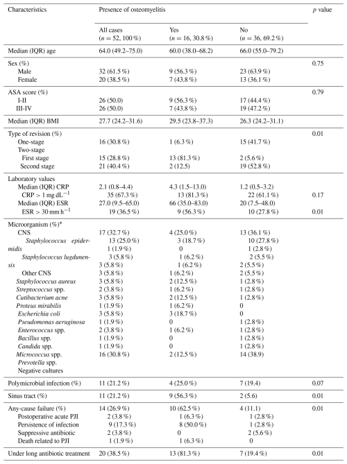 Table 1Main demographics of the patients included for the final analysis, according to the presence of histological signs of osteomyelitis. SD: standard deviation; CNS: coagulase-negative staphylococci; GNB: gram-negative bacilli; ASA: American Society of Anesthesiologists; BMI: body mass index; PJI: prosthetic joint infection.