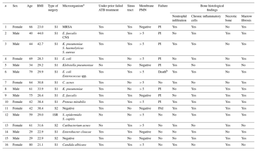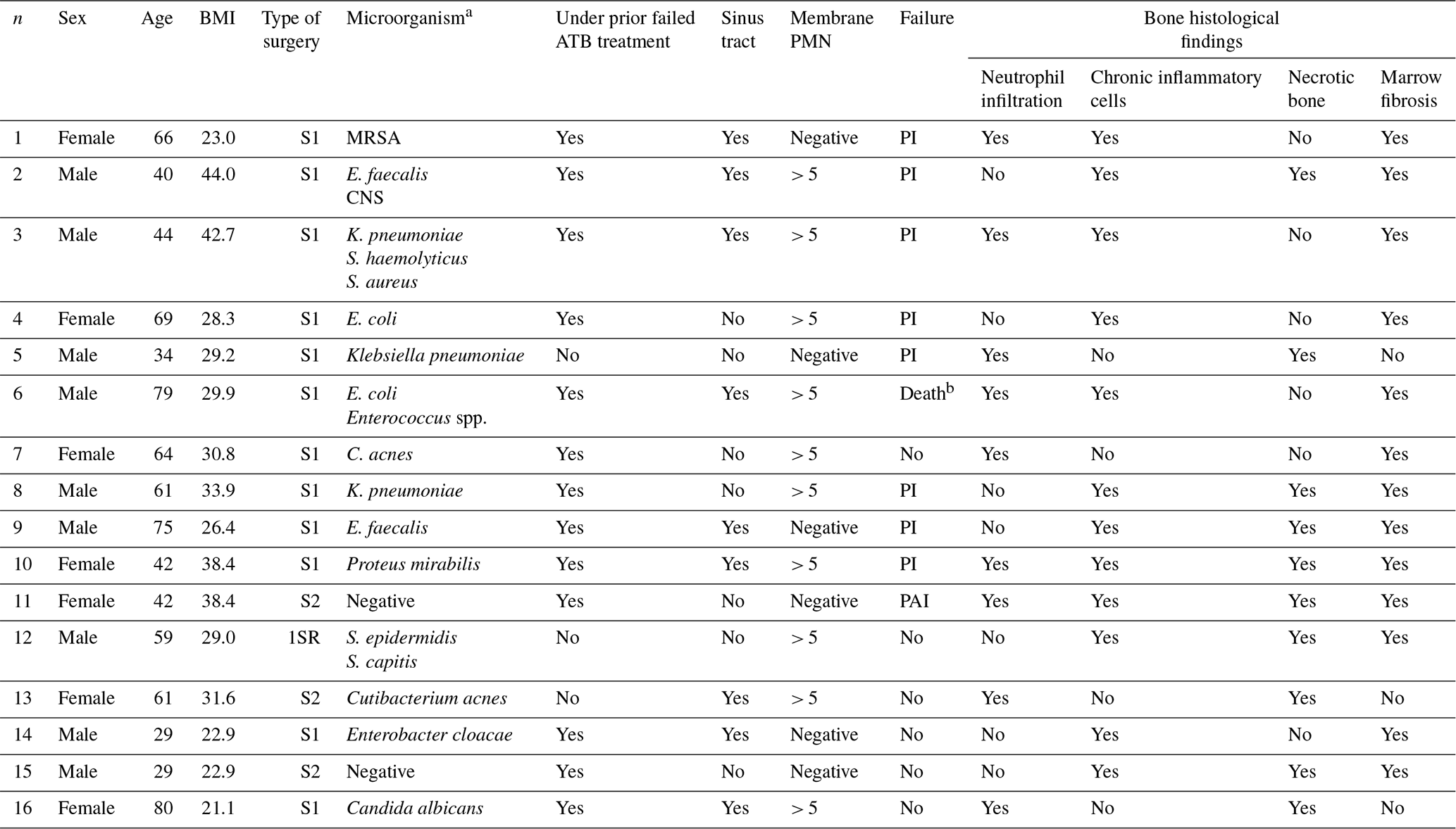 Table 2Summary of the 16 cases exhibiting histological signs of osteomyelitis. S1: first stage of a two-stage revision; S2: second stage of a two-stage revision; 1SR: single-stage revision; BMI: body mass index; CNS: coagulase-negative staphylococci; SAUR: Staphylococcus aureus; PMN: polymorphonuclear leukocytes; PAI: postoperative acute infection; PI: persistence of infection; MRSA: methicillin-resistant Staphylococcus aureus; ATB: antibiotic.