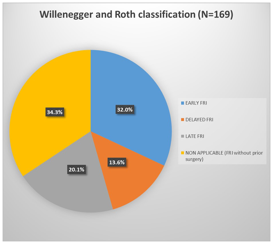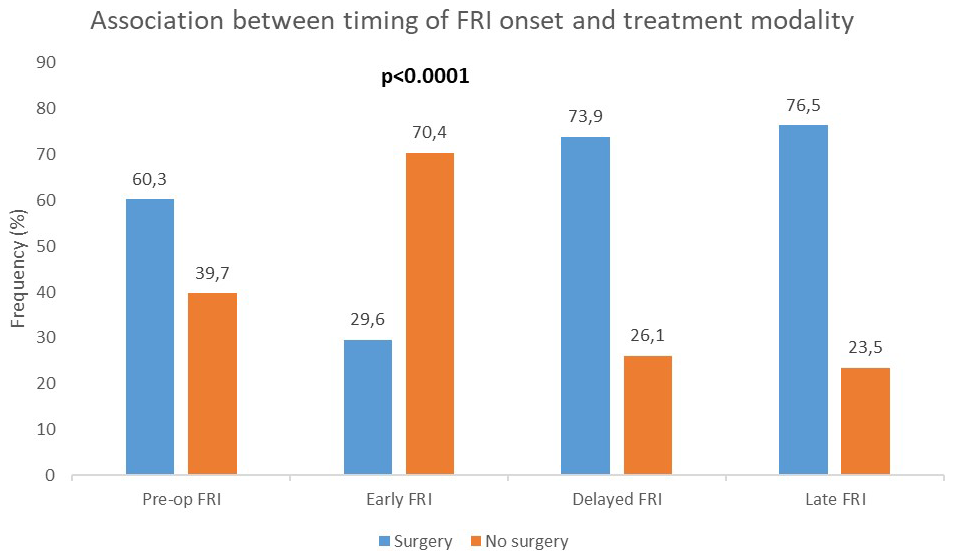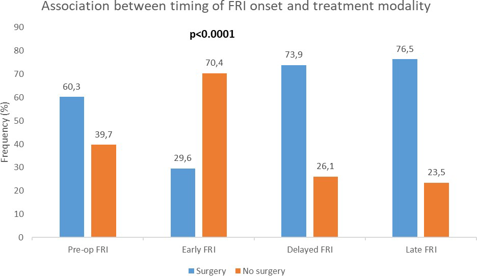 There was a significant association between the timing of FRI onset and treatment modality (surgical vs. non-surgical) (Fig. 3). Surgery was most frequent in delayed (73.9 %) and late FRI (76.5 %) than in early FRI (29.6 %). Notably, 60.3 % of patients who developed FRI without prior surgery underwent surgical treatment (p<0.0001).