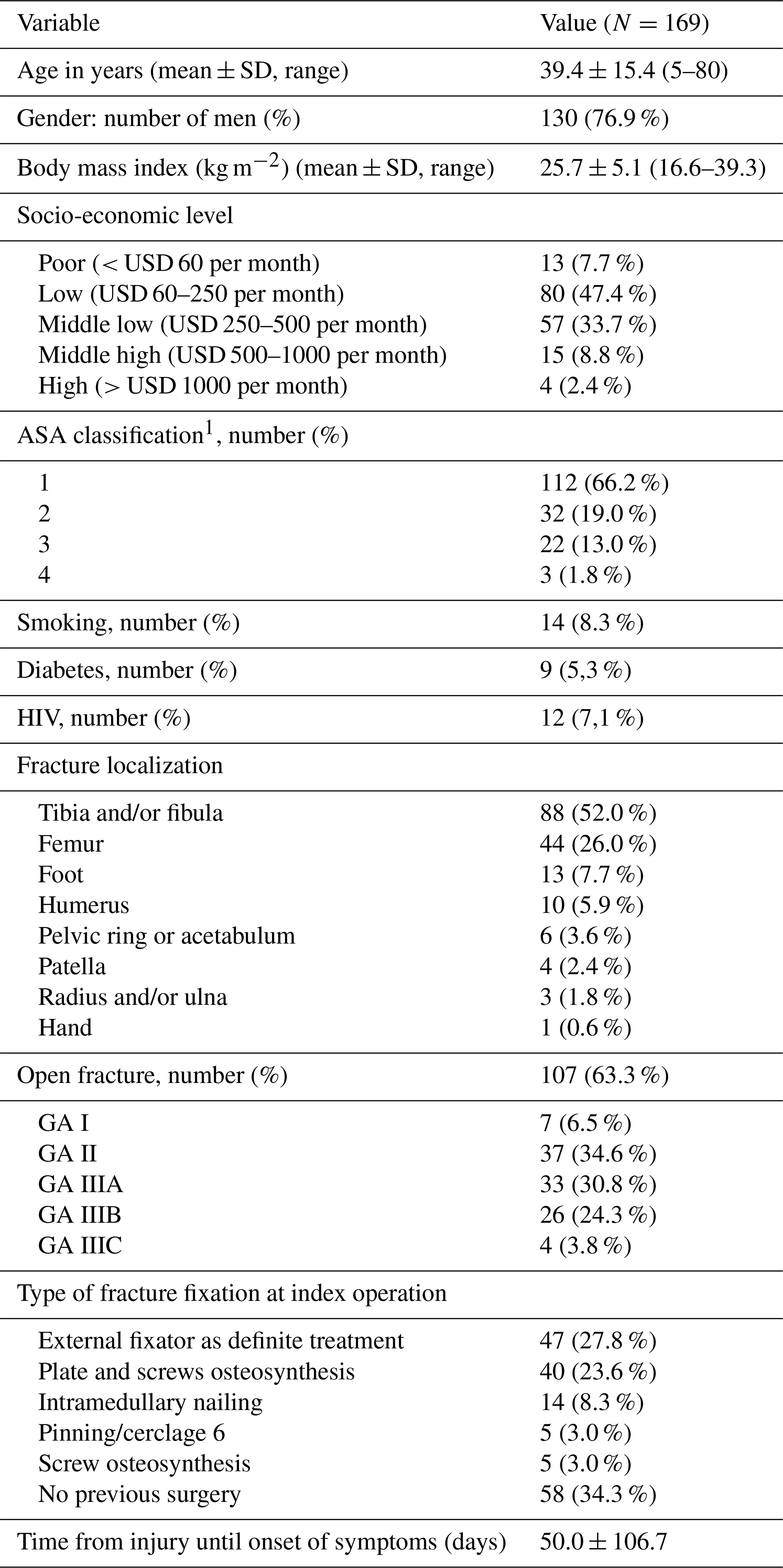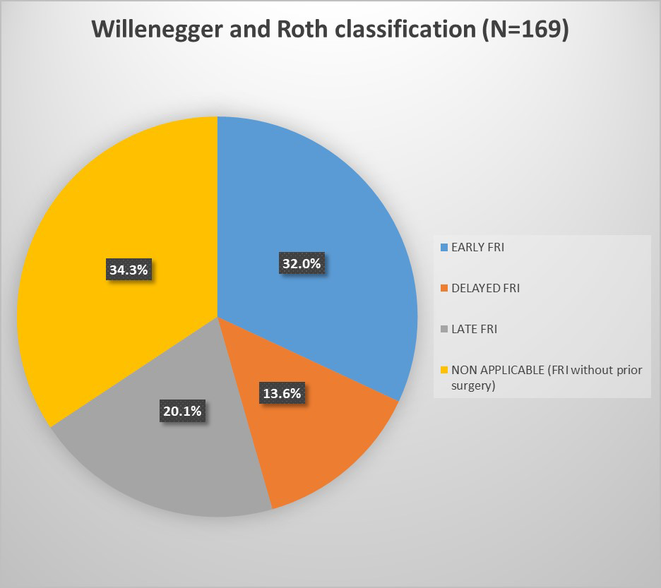 During the study period, 169 patients were diagnosed and treated for FRI. Baseline characteristics are summarized in Table 1. Most patients were young males from low–middle socioeconomic backgrounds and otherwise healthy (ASA I). FRIs mainly followed open fractures (63 %), involving predominantly the tibia and femur. Index fractures were most often fixed with external fixation or plates, but over one-third were managed non-surgically. The mean interval from injury to FRI diagnosis was 50.0 ± 106.7 d. According to Willenegger and Roth, FRIs were early in 54 cases (32.0 %), delayed in 23 cases (13.6 %), and late in 34 cases (20.1 %) (Fig. 1). The 58 patients without prior surgery – 51 open fractures and 7 treated by bonesetters – could not be classified with this system, as it is based on the interval between index surgery and onset of infection. This could not be applied as no surgical time point was available.