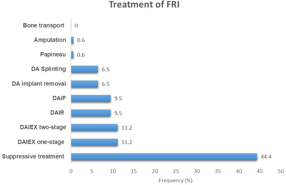 Figure 2Distribution of cases according to the treatment performed. DAIR: debridement, antibiotics, and implant retention; DAIEX: debridement, antibiotics, and implant exchange; DAIF: debridement, antibiotics, and initial fixation in previously non-stabilized fractures; DA: debridement, antibiotics.