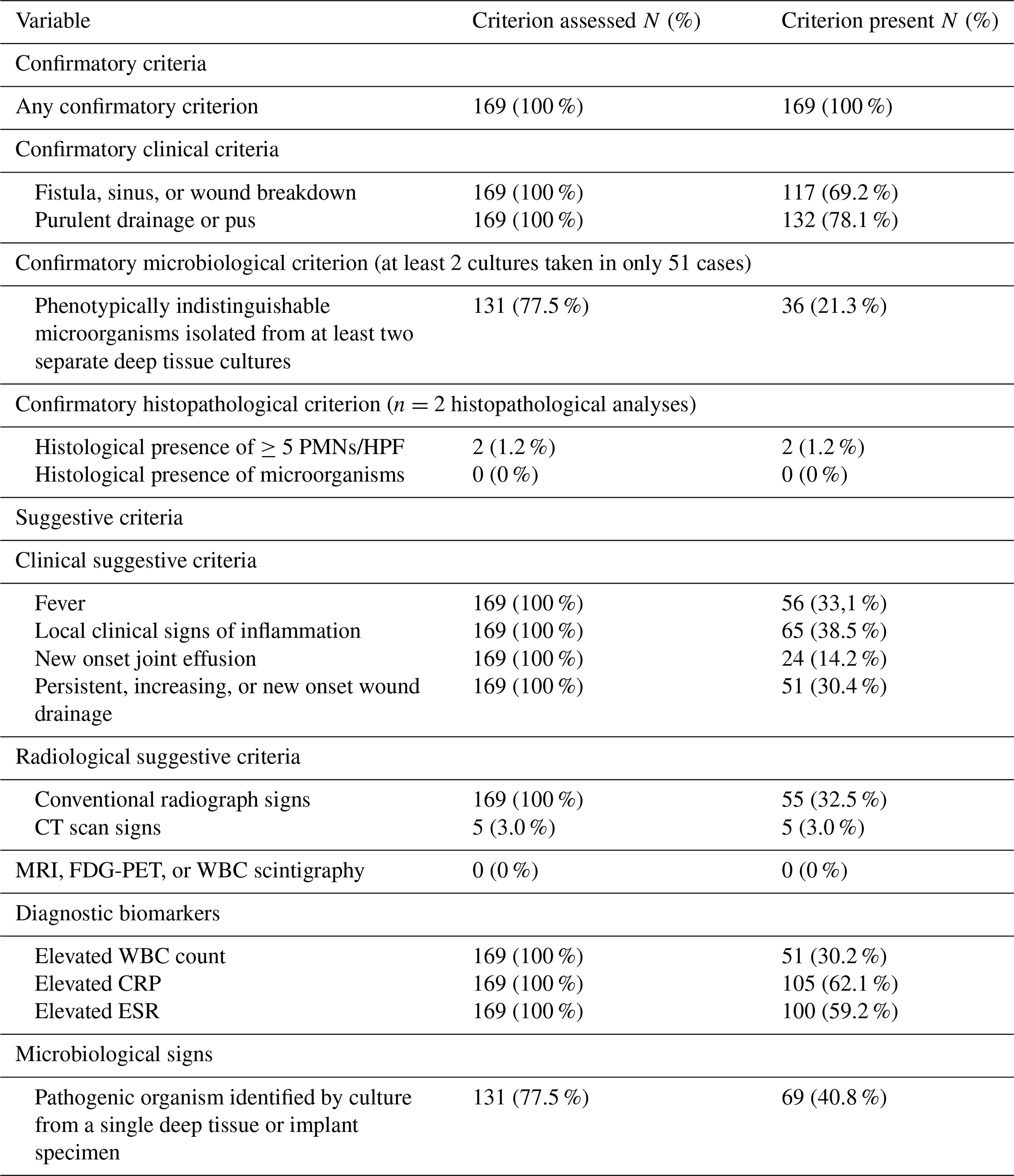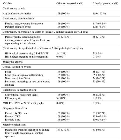 The prevalence of confirmatory and suggestive diagnostic criteria is shown in Table 2. All patients had at least one confirmatory criterion, with 164 (97 %) displaying a clinical confirmatory sign. Microbiological analysis was performed in 131 (77.5 %) cases, with confirmatory criteria met in only 36 (21.3 %) patients, largely due to insufficient sampling (≥2 samples in only 39.0 % of patients). Histopathology was done in only 2 cases (1.2 %), both positive. Among suggestive criteria, local signs of inflammation (N = 65, 38.5 %), fever (N = 56, 33.1 %), and wound drainage (N = 51, 30.4 %) were most common. Elevated white blood cell (WBC) count and CRP were observed in 51 (30.2 %) and 105 (62.1 %) patients, respectively. Plain radiographic signs were present in 55 patients (32.5 %). Only 5 patients (3.0 %) underwent CT scans. No MRI, 18FDG-PET, or scintigraphy was performed. Pathogens were isolated from a single culture sample in 69 cases (40.8 %).