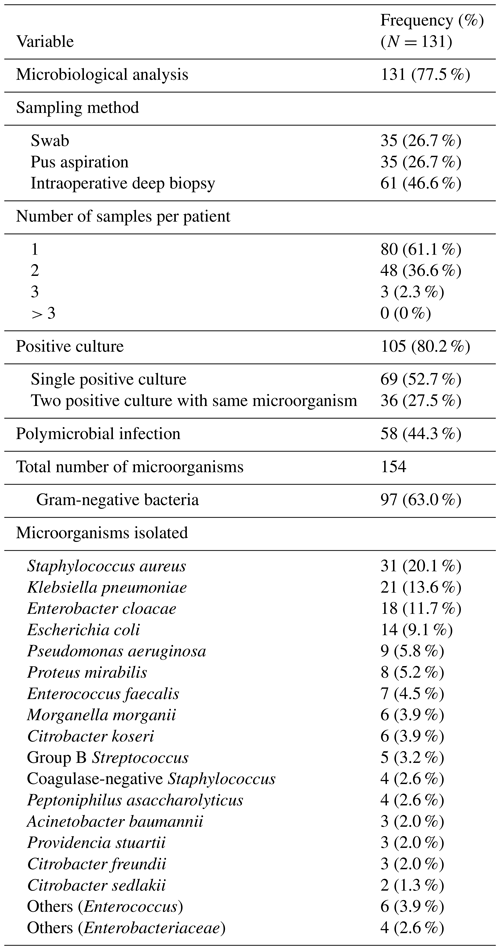 Of 131 patients (77.5 %) who underwent microbiological analysis, intraoperative biopsies were obtained in 61 (46.6 %) cases. The mean number of samples was 1.4 ± 0.5 (range 1–3); none had ≥5 as recommended. Cultures were positive in 105 patients (80.2 %). Infections were polymicrobial in 58 cases (44.3 %), and Gram-negative bacteria were predominant (N = 97, 63 %).