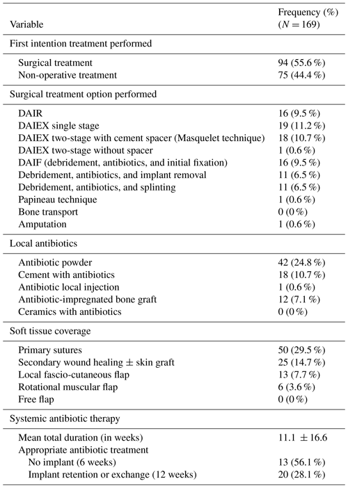 No MDT approach was applied. Suppressive antibiotics were the main treatment (N = 75, 44.4 %). First intention treatment of FRI involved surgery in only 94 (55.6 %) cases (Table 4). The most commonly used procedures included one-stage implant exchange (DAIEX, 11.2 %), two-stage DAIEX with a cement spacer (Masquelet technique, 10.7 %), debridement and initial fixation in previously non-stabilized fractures (DAIF, 9.5 %), and debridement with implant retention (DAIR, 9.5 %) (Fig. 2).