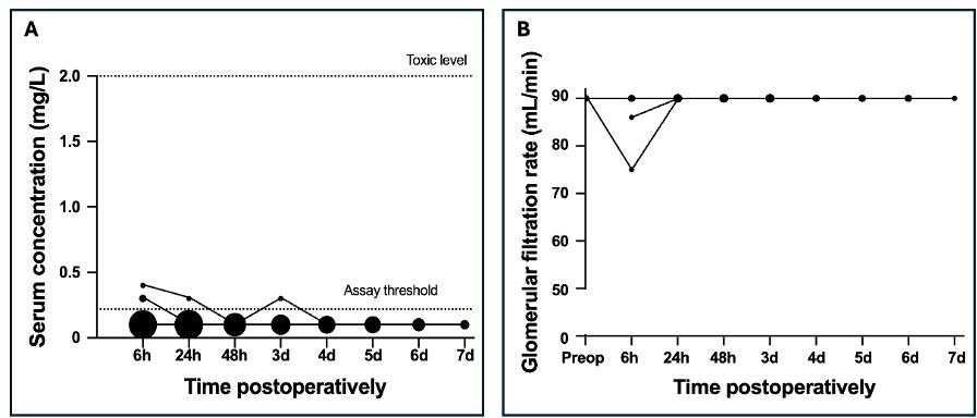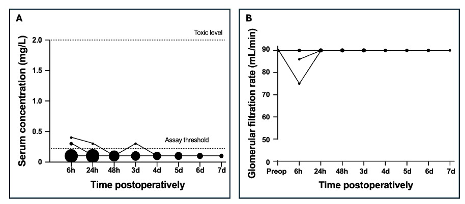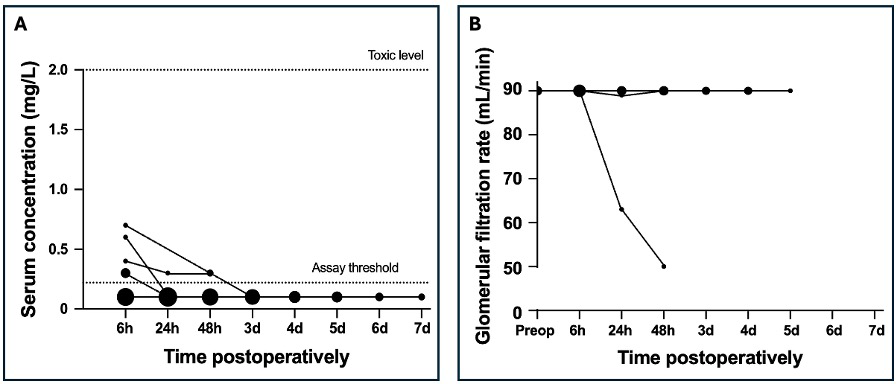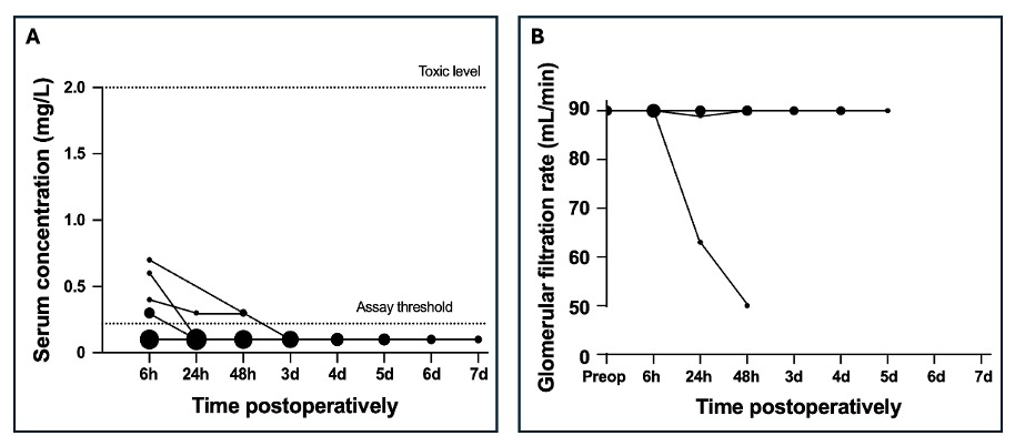 The vancomycin concentration was determined in 60 samples after 21 surgeries in 16 patients. None of these were above the LLOQ of 0.70 mg L−1. These results are in line with recent studies demonstrating the safety of locally administered vancomycin in trauma patients. In a substudy of the VANCO trial, O'Toole et al. (2021) did not find any detectable serum vancomycin levels at 1 h and 6 to 8 h postoperatively in patients treated with 1000 mg of topical vancomycin only. An increase in serum creatinine was found in only one patient with undetectable vancomycin levels. In a follow-up study – a secondary analysis of PREP-IT trial data – O'Hara et al. (2022) found no association between cumulative doses of vancomycin and drug-induced acute kidney injury (AKI).