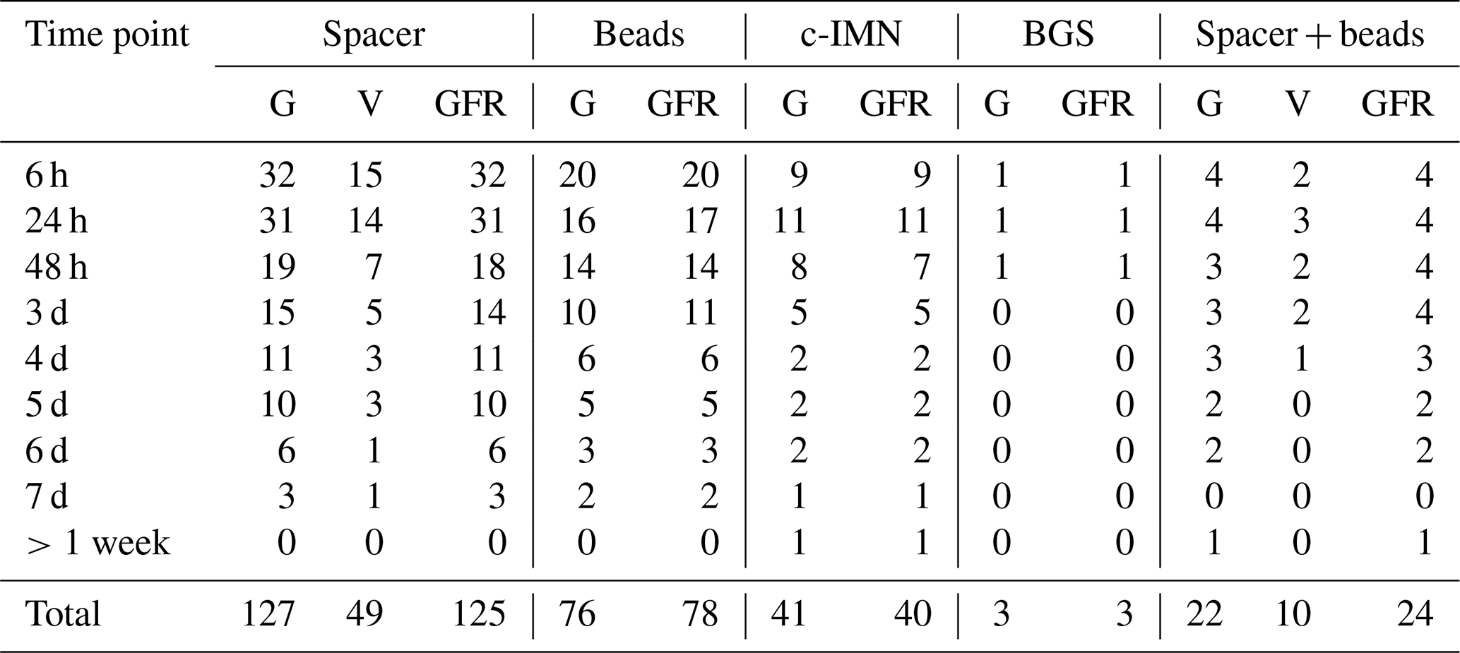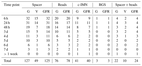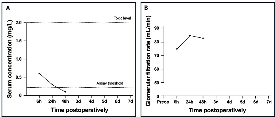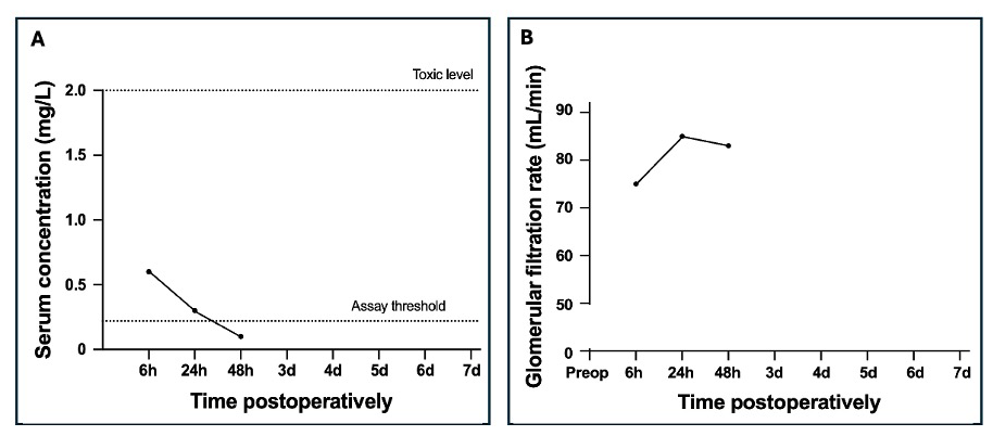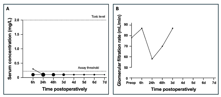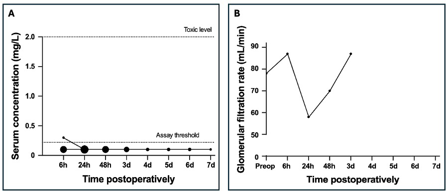 During six surgeries, gentamicin PMMA beads were combined with a PMMA spacer containing gentamicin with (n=5) or without (n=1) vancomycin. The median amount of implanted gentamicin and vancomycin was 1002 mg (P25–P75: 738–1356 mg) and 3000 mg (P25–P75: 2000–4000 mg), respectively. The LLOQ was exceeded once for gentamicin. In this patient, a gentamicin concentration of 1 mg L−1 and a GFR of 82 mL min−1 were measured 6 h postoperatively. Preoperative renal function was normal. The patient left the hospital immediately after and no further short-term follow-up was performed. However, the patient was later included again because of another surgery, and their renal function had returned to normal. The LLOQ for vancomycin was never exceeded.