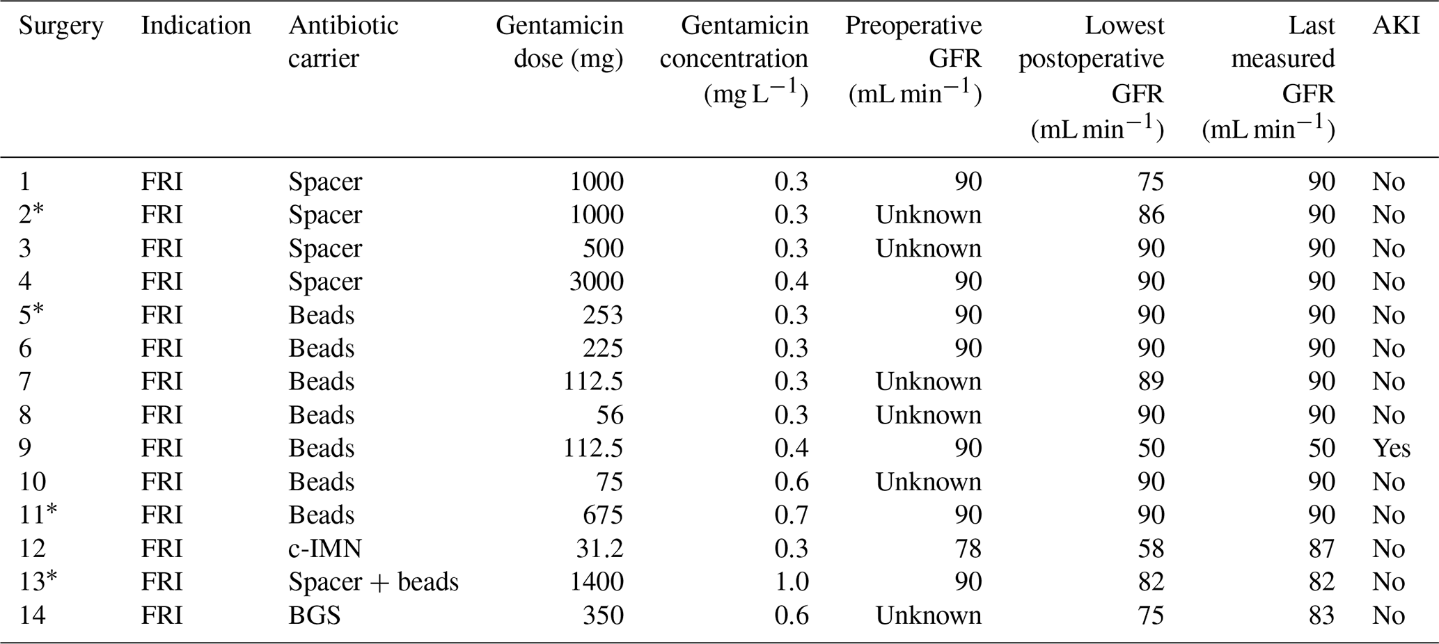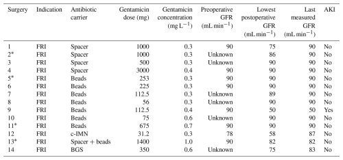 AKI: acute kidney injury; BGS: bone graft substitute; c-IMN: coated intramedullary nail; FRI: fracture-related infection; GFR: glomerular filtration rate measurements. * Two surgeries performed on the same patient.